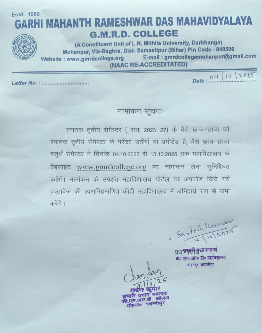 NOTICE REGARDING UG 4TH SEMESTER ADMISSION (2023-27)