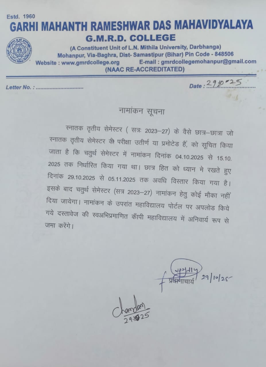 NOTICE REGARDING UG 4TH SEMESTER ADMISSION (2023-27) DATE EXTENDED OF 05-11-2025